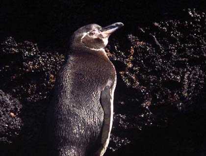 Wow! There is no other way to describe the fantastic day we had. Today we reached the central area of the Galápagos, and our first island was Sombrero Chino, a small spatter cone off the coast of Santiago Island. Dividing both islands is a channel with crystal-clear turquoise waters. Just after breakfast, we left the National Geographic Islander to explore the coastline from our Zodiacs. Our goal: to find the elegant Galápagos penguins. A small colony inhabits this area, and since the weather conditions were clear and sunny, many were already in the water chasing the little fish. One penguin seemed to have had enough and gave us the wonderful opportunity of photographing it standing on some rocks. What a treat!