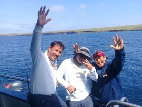 We woke up early in the morning as National Geographic Islander navigated along the northern part of Isabela Island. Slowly the sun appeared above the clouds surrounding Volcano Wolf. We spotted our first birds as Galapagos fur seals returned to shore from their night hunt. We enjoyed a great breakfast. Afterward, expedition leader Vanessa called everyone to the bow to celebrate as we crossed the equator. Our guests happily crossed the line. Approaching Punta Vicente Roca, the visitor site, we spotted Galapagos sea lions and a good number of ocean sunfish. The first activity of the day took place as we dropped anchor at Punta Vicente Roca. This is a spectacular geological site. The combination of the former volcano’s tall cliffs and the tuff cones formed later adds an amazing contrast to this unique visitor site. Our best tools for exploration, our Zodiacs, were lowered down, and off we went to explore the coast. We observed Nazca boobies and blue-footed boobies resting on the small ledges of the tuff cones. Galapagos sea lions swam close to our Zodiac, and Galapagos penguins rested on a broken piece of the tuff cone after feeding. What a wonderful sight! In a calm area, we found a good number of Pacific green sea turtles. The morning’s activities ended with snorkeling. Pacific green sea turtles, plenty of colorful fish, Galapagos marine iguanas and flightless cormorants surrounded us. It was a phenomenal experience! The ship was repositioned toward Fernandina Island. The youngest island of the archipelago, Fernandina is a highlight of our expedition. This island shows our guests the beginning of life. We observed animals thriving in the hostile environment. Pioneer plants like lava cacti grow on the lava fields, breaking down rocks little by little to create soil for the next generation of plants. Punta Espinoza is known for its huge colony of Galapagos marine iguanas. It is hard to distinguish the iguanas from rocks since they are so dark in color. On the other hand, colorful Sally Lightfoot crabs added contrast to the young, dark lava fields. We ended our walk as the sun was setting, returning to the ship with great memories. It was a fantastic day in the western part of the archipelago.
