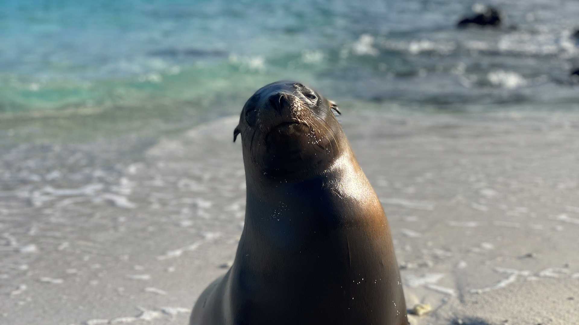 We spotted an adult Galapagos penguin with two juveniles standing on a small peninsula of lava on the shore of Santiago, across from the beach on Sombrero Chino. Beachgoers and snorkelers saw whitetip reef sharks, and a young Pacific green sea turtle cruised slowly under the snorkelers, giving everyone a perfect view. It came up once for air, positioning itself discretely at a distance for this task, before once more submerging and generally hanging out underneath us.