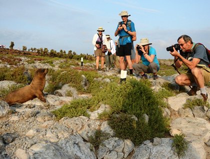 After we disembarked we took a mile walk over boulders searching for the Santa Fe’s land iguana, a different species which can only be found here and nowhere else in the world. This place has two white sandy beaches with many sea lions.  Mommies, babies and daddies (if you prefer to humanize them) were everywhere, resting and playing. This species may be our guests’ favorite.