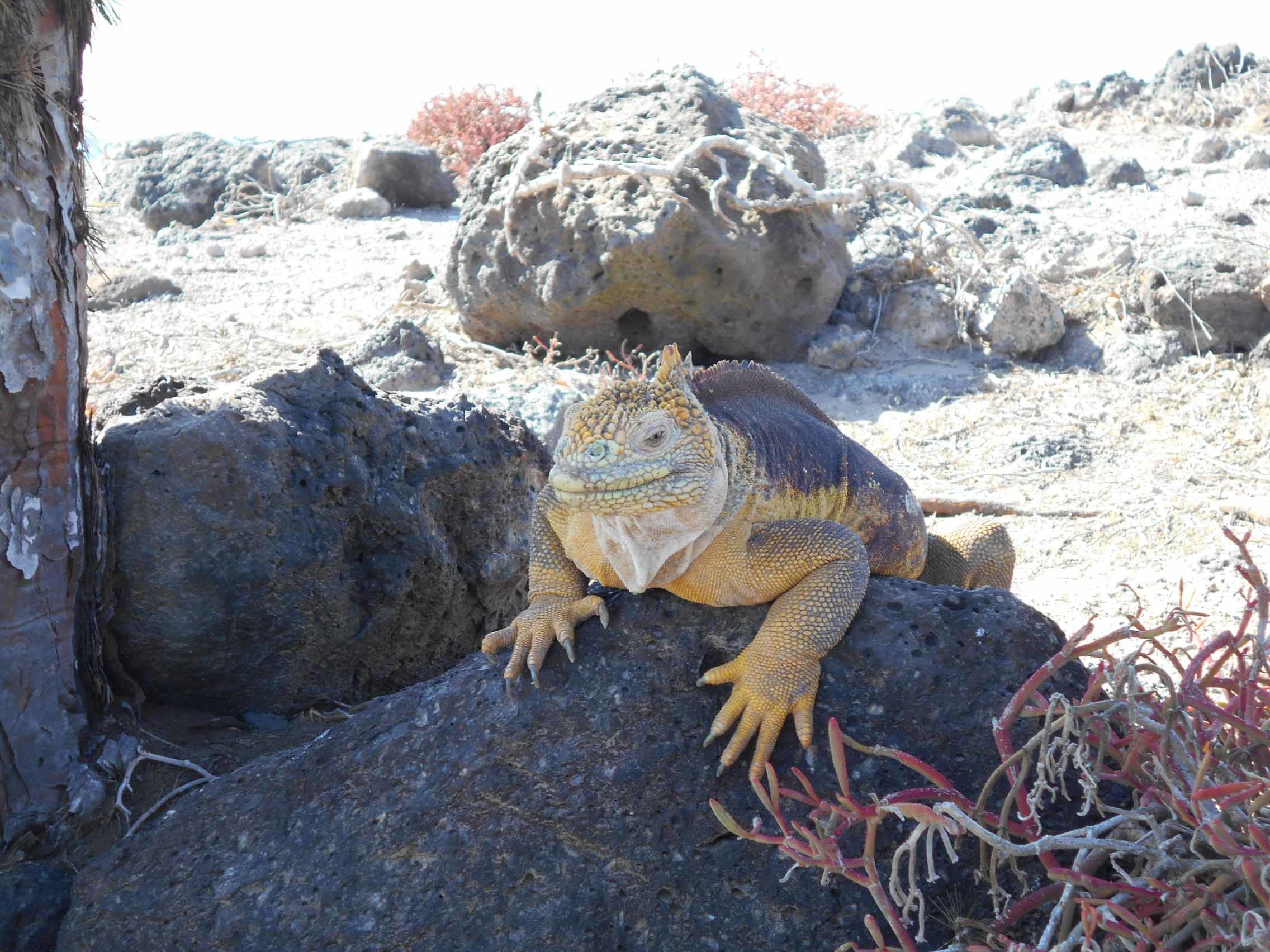Today we had a sunny morning with a nice breeze, excellent for our two-hour hike on South Plaza, which is a tiny island of the Galapagos Archipelago, less than one square mile, but with lots of wildlife and an impressive landscape. At the landing spot there is a colony of sea lions, and the pups were playfully waiting for us. Right next to the landing platform we were able to see a group of land iguanas resting under giant cactus trees. Just a little bit further we saw another of the unique species of the islands, the wonderful swallow tailed gulls, nesting on the ground right next to the trail. The island is very interesting geologically speaking, it has the shape of a ramp and is one of the few that resulted from the uplifts of colliding mini plates, so one side is a high cliff about 50 feet, while the other is only few inches above the water. Since the island is so little, it is possible to see the ocean water from every single point of the trail. The combination of colors such as the blue turquoise surrounding the place, and the red and green of the vegetation is simply marvelous. After this experience, we went back to our vessel and we had the chance to swim and refresh ourselves.