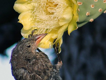 The trail leads to a spectacular cliff side where many sea bird species were seen flying, resting and/or feeding their chicks. Galapagos shearwaters were seen swiftly skimming the ocean surface looking for food. Swallow tailed gulls were seen either flying around or taking care of their hungry offspring. Occasional frigate birds and some Darwin finches were seen gliding in the blue sky as well. Some of these emblematic bird species were seen laboriously looking for food in the cacti blossoms that abound on the island.