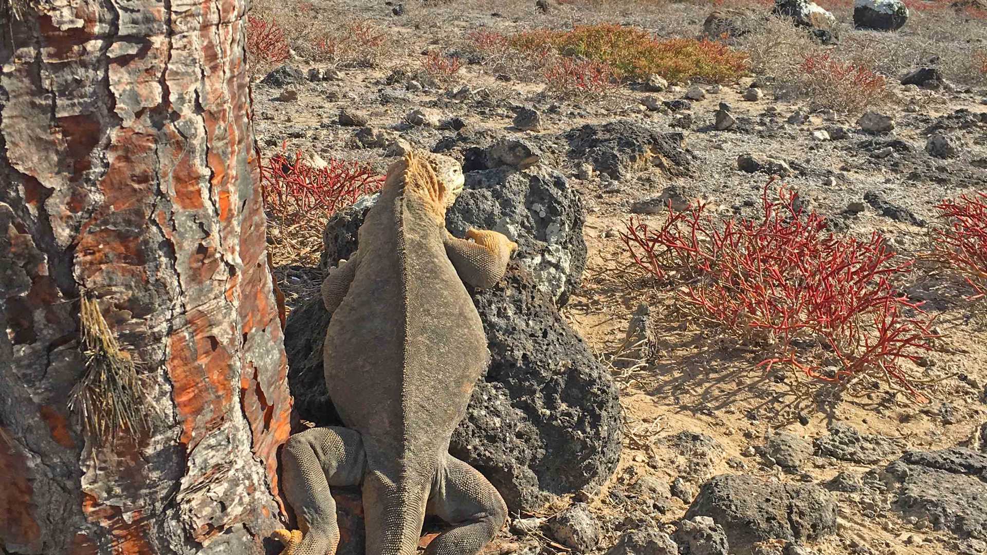 South Plaza is a very small volcanic uplift along the coast of Santa Cruz Island. As we approach we are treated to a kaleidoscope of reds, greens, and oranges as the vegetation makes this place come alive with color. As we head inland there appears to be a Galapagos land iguana under every single Opuntia prickly pear cacti. This is one of the densest populations of Galapagos land iguanas in the archipelago. There are so many land iguanas that they have overlapped with a breeding population of marine iguanas and have produced hybrids which look like zebra iguanas with a mix of grey and black strips upon their backs.