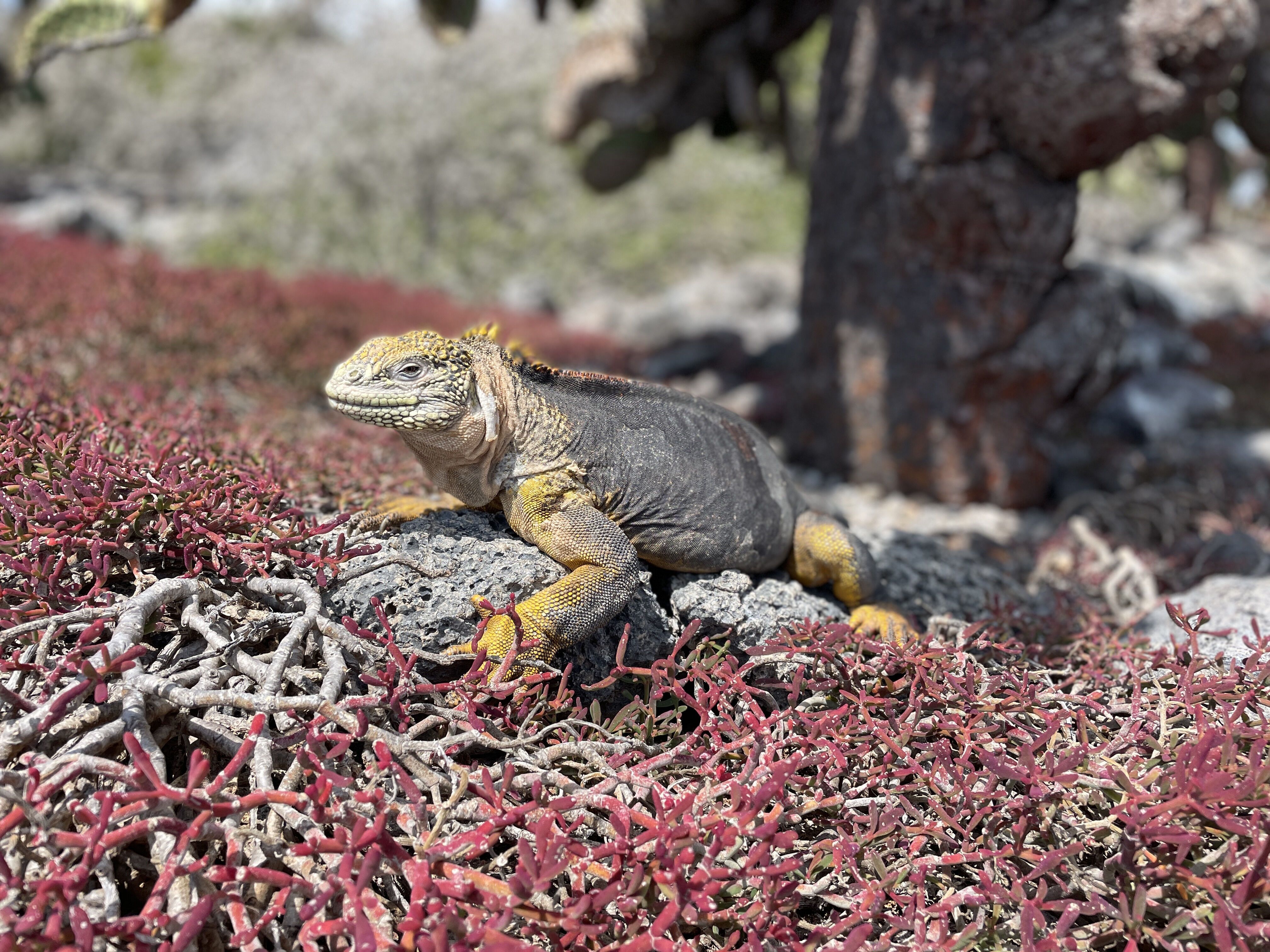 In the afternoon, Santa Fe Island offered us the chance to observe unique species like the Santa Fe land iguana, which is quite different from the Galapagos land iguana. Santa Fe land iguanas are not only bigger in size, but much more of a pale yellow in coloration. A boulder trail, surrounded by a dense forest of treelike cactus called Opuntia, ended at a white sand beach crowded with a colony of sea lions resting at sunset.