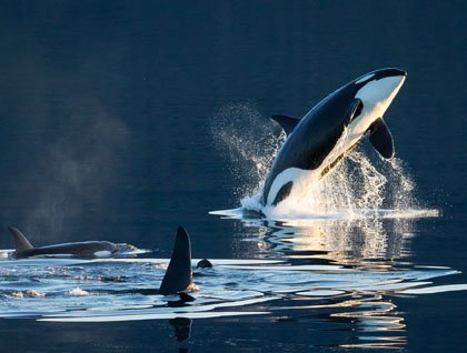 We eventually returned to the warmth of our ship, and turned to make our way back along the winding course of the fjord. We paused again near the mouth of the fjord, this time awaiting a float plane from Juneau that delivered our final two guests who were arriving a bit late to the ship, but in grand style. The sun continued to glance off of the snow-draped peaks, casting magical reflections across the waters as we left the fjord, returning into Stephens Passage. After dinner, Dall's porpoises came to ride along on the ship's bow wave. Shortly after they departed, the call came out that a group of killer whales had been sighted ahead of the ship. We drew closer and slowed to watch them. It was a large group of resident-type whales named AG-Pod by researchers, which have been known from the waters of Southeast Alaska and also Prince William Sound for several decades. As the sun was dipping low over Admiralty Island, the killer whales cavorted as if with glee; lob-tailing, spy-hopping, and breaching many times to cheers from all of us gathered on the ship's decks. As the whales continued surfacing peacefully around us, alpenglow tinted the snowy peaks of the Coast Range as the setting sun painted colorful skies to end our day.
