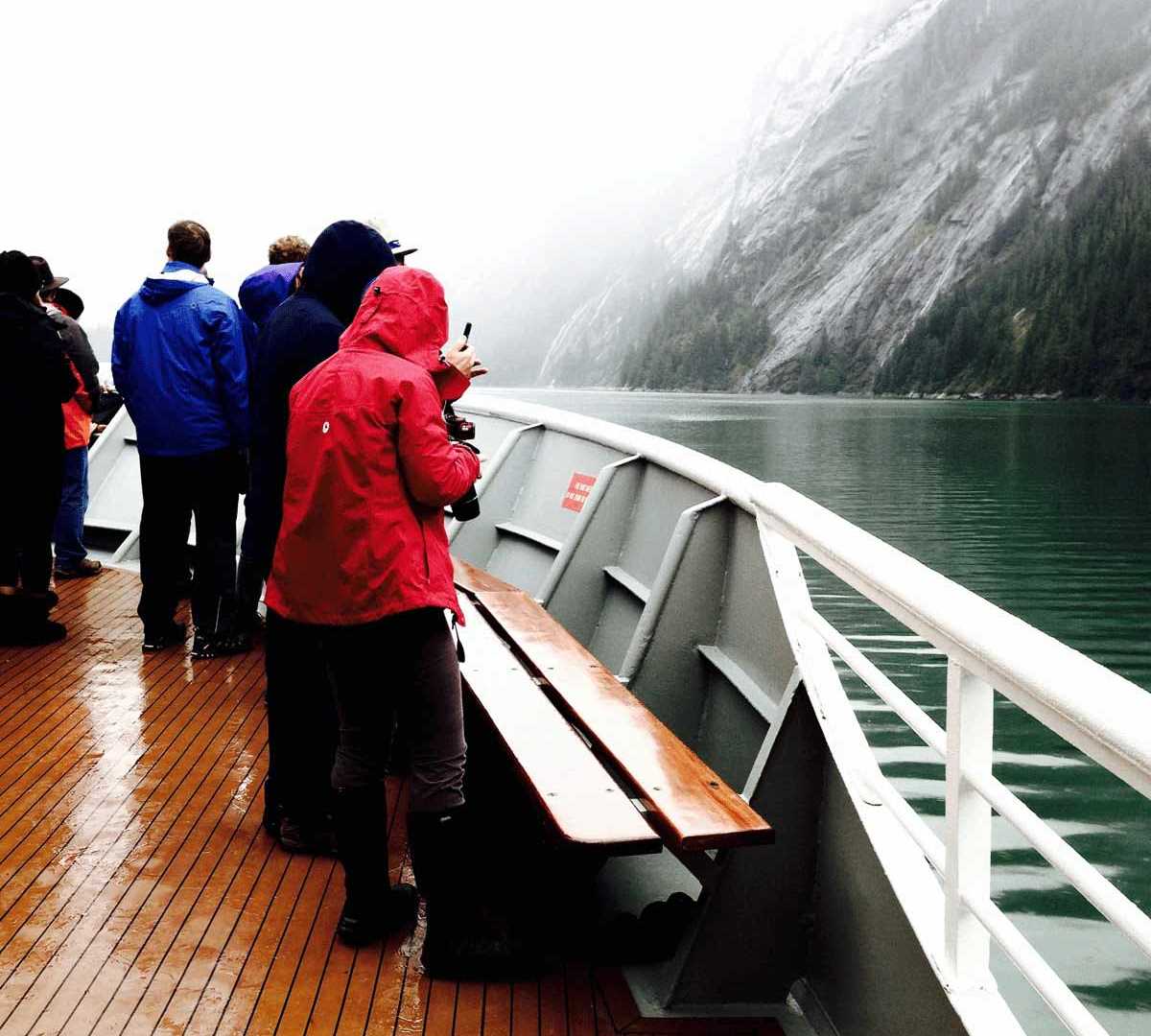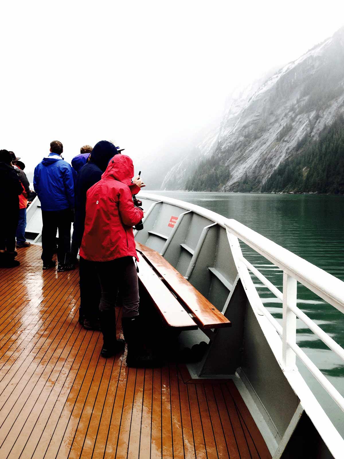 Our exquisite crew aboard National Geographic Sea Bird came out to “the rescue” to warm up our brave fellows on the quest for tidewater glacial ice. Our heroic expedition leader, John Mitchell, led the crusade by driving Anna Marie Becker-Hoover, hotel manager, and her lovely stewards, Sonja Hagemeier, Hayley Chwazik-Gee, and Katie Bayliss out to distribute hot chocolate, crème de menthe, and hazelnut. There were also two special guest appearances by Seattle office stars, Billie McCaslin and Amy Davidson. All were merry and enjoyed their hot beverages as they watched blue ice float by. Blue being the color reflected by the light spectrum creating unique shades.