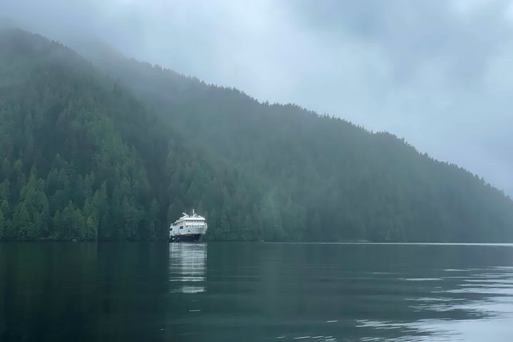 Within the 6.4 million hectares of land dedicated as the Great Bear Rainforest, a maze of small waterways winds amongst many small islands. We had the opportunity to explore this area, specifically a place called the Sue Channel Provincial Park. As we set off on Zodiac tours in search of beautiful views and possibly wildlife, boats full of guests were greeted from afar by the spouts of humpback whales (Megaptera novaeangliae) as they passed through the channel on their travels. The steep, rocky walls that make up the coastline made the search for animals more difficult, but as the tide dropped, small inlets and meadows presented themselves as the perfect spots to catch a rare glimpse of coastal land mammals and other wildlife. For a very brief moment, several guests caught a glimpse of an American black bear (Ursus americanus) foraging on sedges and berries before it darted back into the tree line. Throughout the morning, the search continued. Guests in Zodiacs were treated to incredible views of the peaceful, protected nature around them. The adventure continued as we transited back to Prince Rupert while we scanned the coastlines and looked for humpback whales. We were even treated to a serendipitous, singular breach from one charismatic whale in the distance. The night ended with one last chance to take advantage of the area’s remote nature. We stargazed from the bow in the pitch black of this undeveloped area.