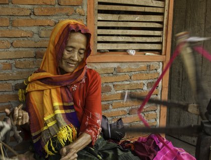 Secure to the dock at Badas, we left the ship immediately after breakfast and climbed into small buses that carried us up into the dry hills of the island to the village of Pamulung. As soon as we arrived we were struck by an aspect of Indonesia that all travelers in the region remark upon: the friendly, open, welcoming nature of the Indonesian people. Strolling through the streets of the little town we were greeted by fathers and sons, grandmothers and granddaughters, and more, all smiling, inviting us to photograph their beautiful, expressive faces, and to look into their homes and share a few words of friendship. In a small courtyard we stopped for a demonstration of the tradition method of making rice flour, pounded by hand in large wooden pestels, and had our first chance to see and purchase the beautiful textiles for which these islands are very deservedly famous.