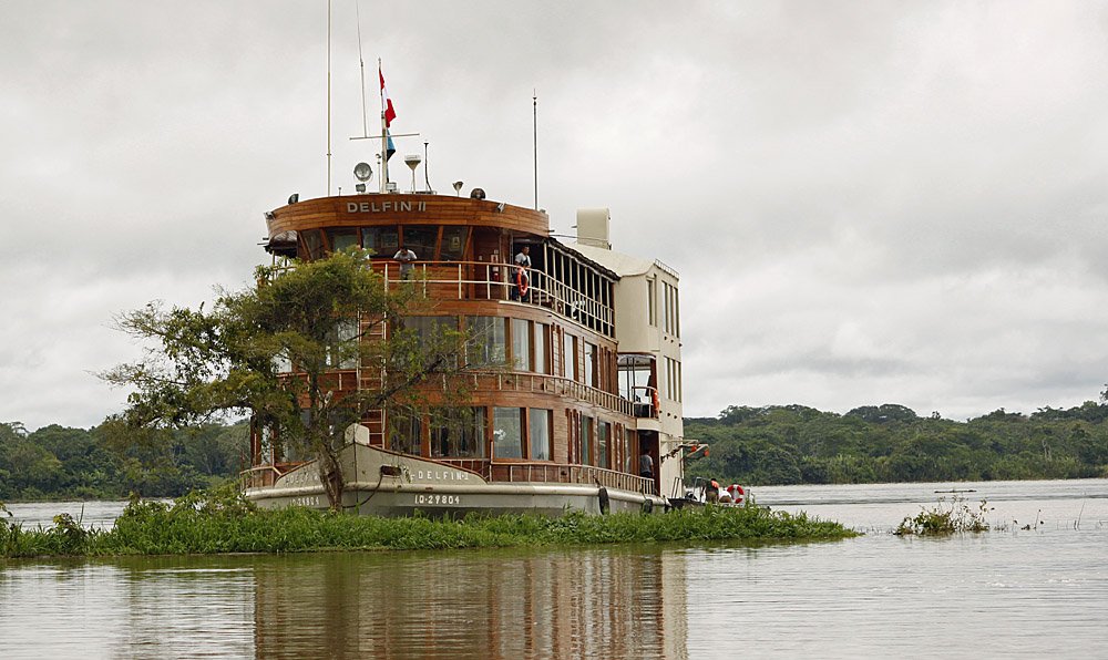 A beautiful calm and relatively cool morning opened our expedition today. We had a persistent drizzle rain that did not stop us from exploring the area. After breakfast as the rain decreased its intensity, we went to explore Supay Caño by skiff boats. Wildlife is usually very active after the rain, for critters came out to eat later in the day. We were very lucky for we saw many bird species like flycatchers, nighthawks, herons, kites, tanagers, parrots, etc. We even spotted a couple of the rarely seen dusky titi monkeys high up in the canopy. In the afternoon the sun was shining and we had a beautiful visit to Puerto Miguel. We admired the giant water lilies and paid a visit to the largest and most diverse handcrafts market in this side of the Ucayali River. At sunset, reluctantly, we came back onboard with our minds and spirits filled with all the new adventures and feelings that the Upper Amazon left in our lives.