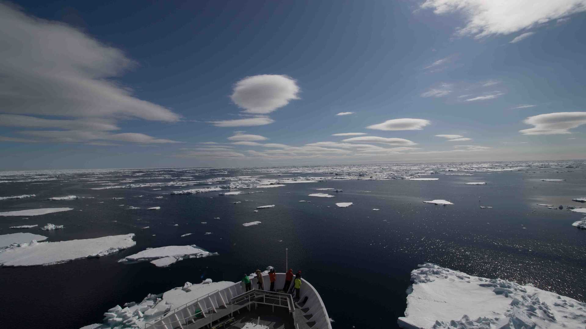 While we continued searching, we heard talks by our distinguished guest speakers and the ship’s naturalist staff. In the middle of the afternoon, we found a space where the ice floes gave way to open water where we got into Zodiacs for a close-up experience with pack ice and the various shapes and forms of ice. A few species of Arctic seabirds were around, and we even spotted some bearded seals.