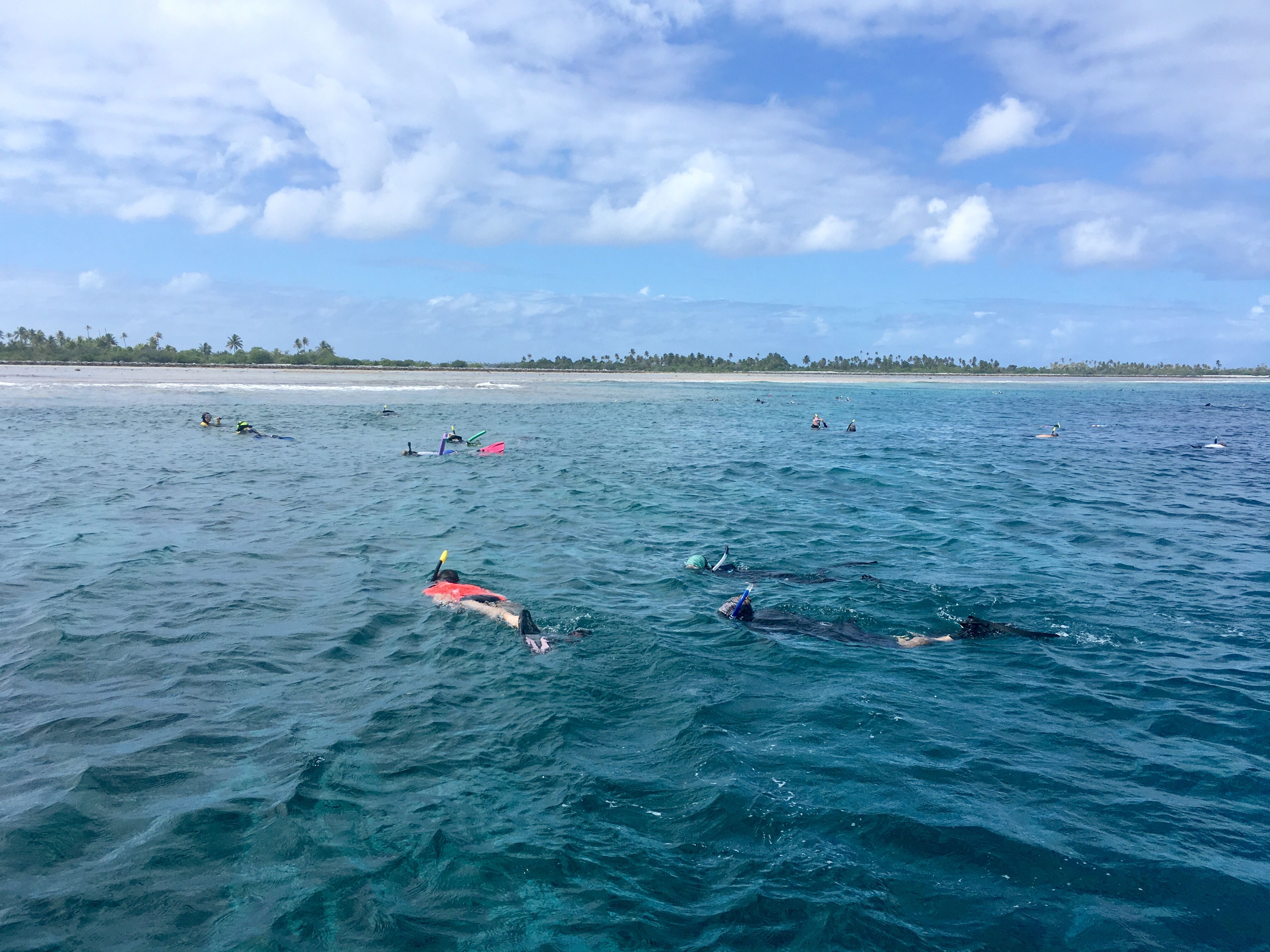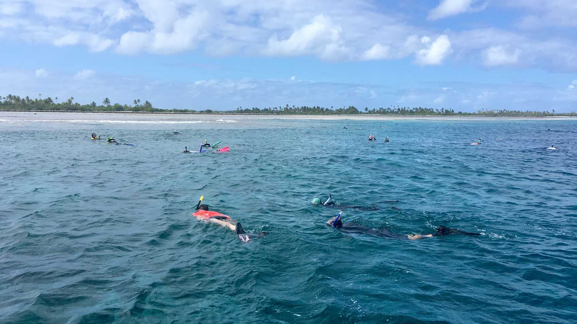 At sunrise we were anchored at the entrance to the lagoon of Takaroa Atoll. The pristine waters and the colors of the reef were an invitation to explore the underwater world. We set our snorkeling platform at the edge of the reef, where our guests could enjoy the ocean and its inhabitants.