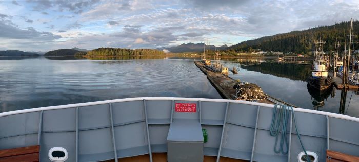 National Geographic Quest arose amidst light clouds within the protected waters of Ushk Bay. This area is known for a salmon stream and yields plenty of opportunity for kayaking and exploring the vast meadows of its inner waterways. On this day’s occasion, guests were able to hike and paddle their way along the coast of Ushk Bay and witness firsthand the life cycle of Pacific salmon making their way upstream. As we transited through Peril Strait, we were lucky to see humpback whales. These immense mammals were “lunge feeding” very near our ship. Being able to witness this event was unique for guests and staff. Lunge feeding is process through which individual whales push their gaping mouths through the surface and collect any fish or planktonic invertebrates in the process. Witnessing this behavior was truly a remarkable experience for all. We will cherish this moment for a lifetime.