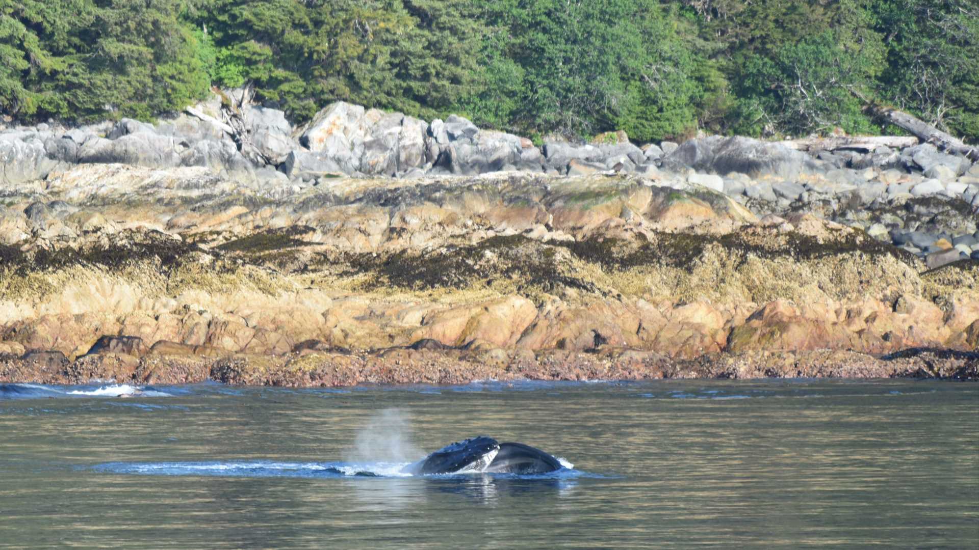 The first thought on everyone’s mind when they woke up this morning: “What is that bright yellow orb in the sky?” The liquid sunshine that is standard for the Southeast Alaskan rainforest had finally abated, bringing a cloudless, sunny day to National Geographic Venture. As guests went to breakfast, the charismatic megafauna was also having a bite to eat. Two humpback whales along the shoreline of Baranof Island were making nets of bubbles to surround juvenile salmon and trap them towards the surface of Chatham Strait. With a stream of air and the flashing whites of the undersides of the whales’ pectoral fins, the salmon fry had nowhere to go but up…but the humpbacks were faster, engulfing them in their 15,000-gallon mouths.