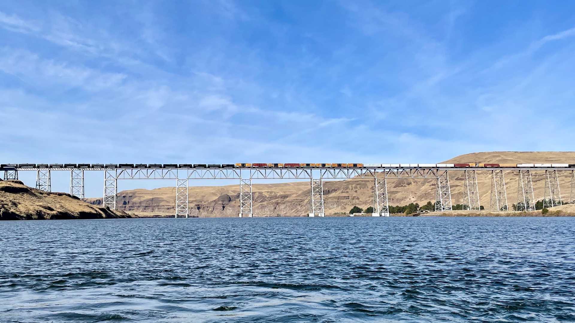 After lunch we renewed our downstream transit, steaming past dark basalt cliffs and broad grassland hillsides. At first glance we can imagine we are seeing the landscape just as Lewis and Clark saw it more than 200 years ago. Historian Patrick MacQuarrie gave us his insights into their journey up to and through this land. Indications of the extensive ranching and farming currently in the Palouse Region is mostly subtle from river level. However, we know the river itself has been dramatically changed in the last half-century by dams and impoundments – quite apparent as we moved through two more locks prior to approaching the final miles of the Snake River this evening, just before it empties into the Columbia River’s main stem.