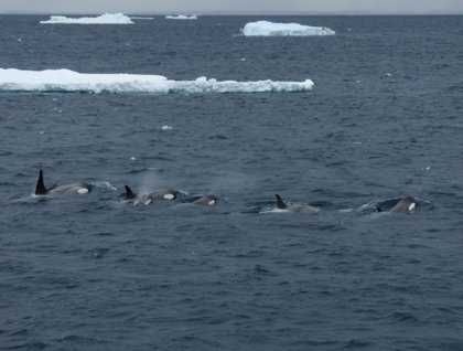 Out on deck we noticed a few changes as we made our way south along the eastern coast of the peninsula: the air was perceivably colder and the icebergs considerably larger. The keen wildlife watchers amongst us were out on deck wrapped up against the Antarctic elements and by mid-morning we were treated to one of the best wildlife encounters we’ve experienced so far on this expedition. A pod of Type B Killer whales had been spotted. For an hour we observed well over a dozen whales, including males, females and juveniles.