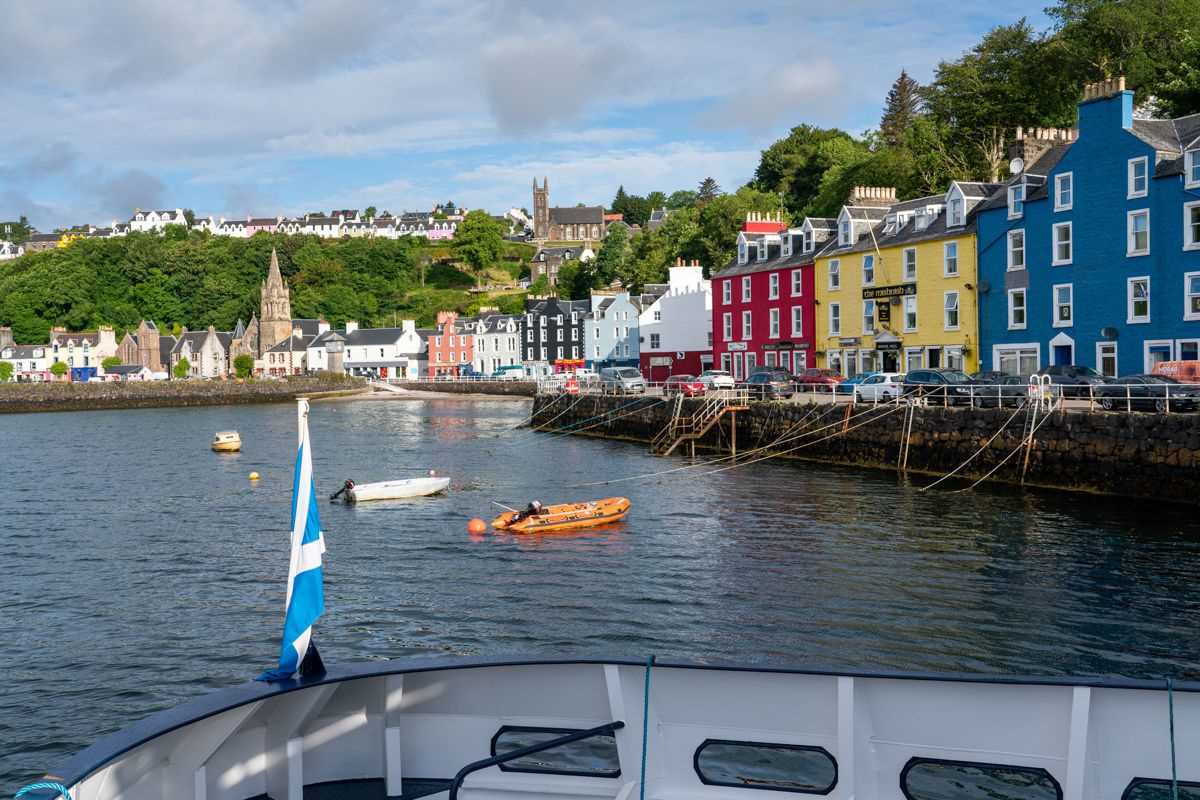 Brilliant sunshine, sparkling waters, and glowing green hillsides greeted us in Tobermory. Yet the weather is always changing in Scotland. Showers moved in by breakfast, and the rain came and went throughout the day.