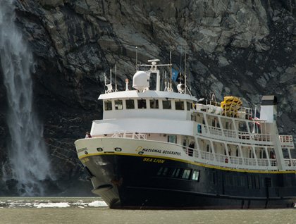 The last day of our expedition dawned with unusually sunny skies in Tracy Arm, a rugged wilderness which early explorer John Muir called “a wild, unfinished Yosemite.” Early risers were treated to an elusive mountain goat nanny and kid wandering in and out of vegetation on a steep, rocky cliff face. Guests emerged from breakfast to outstanding views of the narrow twisting fjord with tiny waterfalls shimmering down from unseen heights and occasional glimpses of high peaks above. The water in front of South Sawyer Glacier was choked with seal-covered ice, and from a distance we had great views of ice-draped peaks behind the glacier. Waterfalls were backlit by sunlight as we turned toward North Sawyer Glacier and loaded into our expedition landing craft.