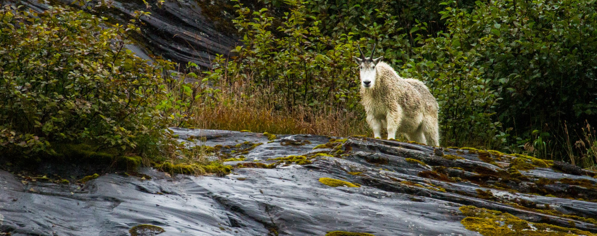 After breakfast we approached the end of the fjord and launched our expedition landing craft to get closer looks at the magnificent South Sawyer glacier. As we wended our way through a gallery of sculpted ice floating in the water, we spotted some mountain goats perched on the cliffs above the fjord. Swimming between the bergs we also encountered several curious harbor seals still hanging around amongst the ice after the pupping season which draws them to the safety of the icebergs had ended. Rounding a bend, the jumble of seracs and crevasses that comprise South Sawyer came into view and we marveled at the phenomenal blue hue.