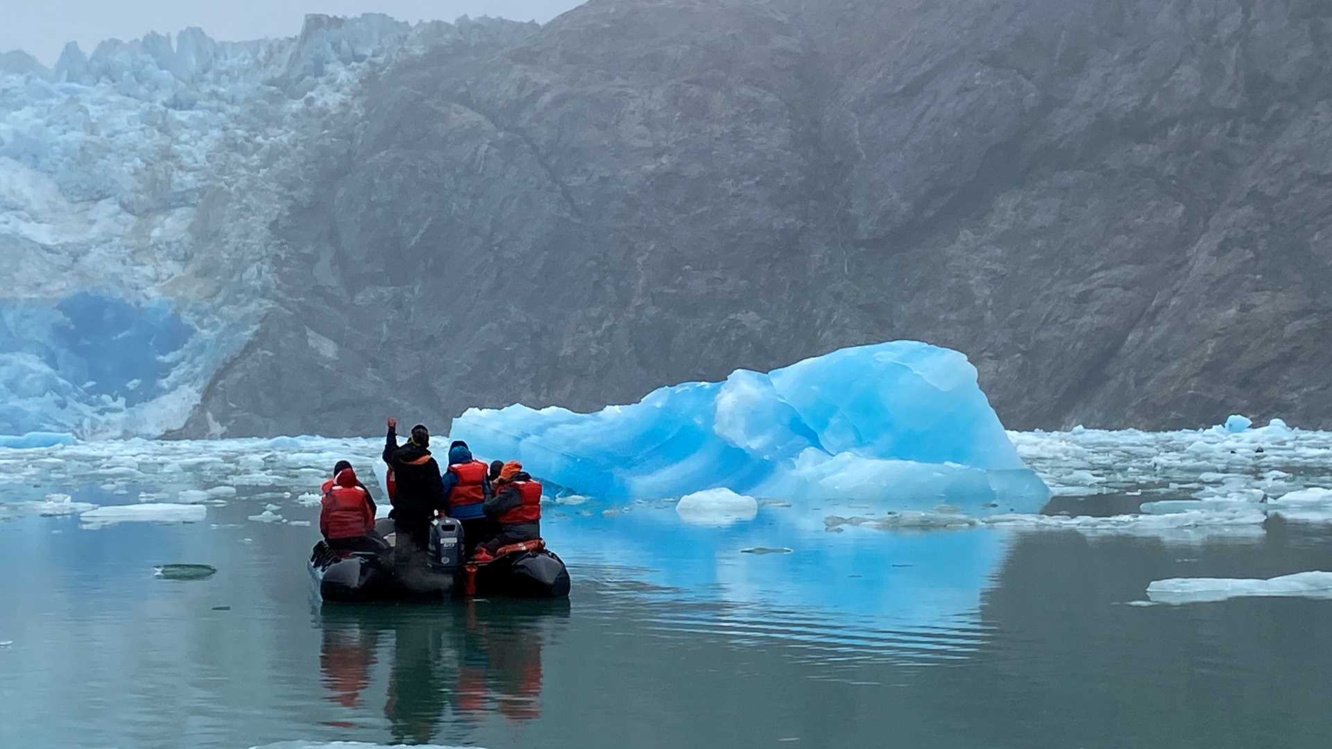 Early risers caught sight of the buoy marking the channel into Tracy Arm-Fords Terror Wilderness. The marker guides boats of all sizes through a narrow channel cut into an ancient terminal moraine that formed when the Dawes and Sawyer Glaciers joined and flowed into Holkham Bay nearly fifty miles from their current termini in Tracy and Endicott Arms. We sailed for nearly three hours through the northern fjord of Tracy Arm before launching Zodiacs to explore the scenery up close to the face of the South Sawyer Glacier. The water was choked with ice that varied in size, all the way up to iceberg scale, exceeding five meters above the water’s surface! Sharp eyes observed mountain goats on a steep rock slope along the south side of the fjord. One guest counted over a hundred harbor seals lounging on the ice floes. Though rather quiet today, the South Sawyer Glacier must have been calving extensively to produce this floating ice.