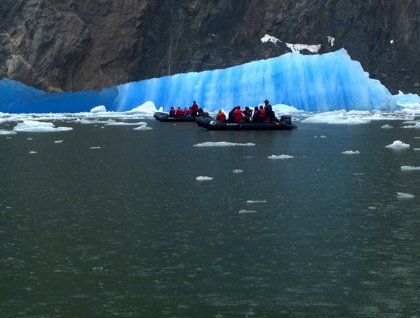 This continued, with each event seemingly triggering the next and drawing cheers from the onlookers, until suddenly a giant wall of ice began to emerge from the water. At first it seemed to be an illusion, as though our eyes had been fooled from staring too intently at the cascading ice. But the upheaval continued and the giant block of ice rose nearly to the height of the glacier itself before plunging back down into the churning water. We all watched with disbelief and excitement as the huge iceberg floated away from the glacier.  Eventually, it came to rest and some of us were able to approach it for a closer look. Part cobalt blue, part frosted blue, and as large as our ship, the massive block of ice lay dormant on its side. We had just witnessed an incredible display that inspired a sense of awe and wonderment.