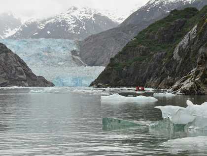 Soon after breakfast, inflatable boats were launched that allowed us to work our way carefully through the icebergs to view the face of South Sawyer Glacier, where we spent some time cruising to observe the texture and patterns in the ice. A light rain fell as we examined the evidence of glaciation such as glacial striations and glacial polish on the steep granite walls. Even the green color of the water was caused by finely-ground glacial rock flour. We were able to get close enough to some of the icebergs to see recently-born harbor seal pups and their mothers. In comparing pictures of the glacier taken just a few years ago, it was obvious that the glacier had retreated dramatically.