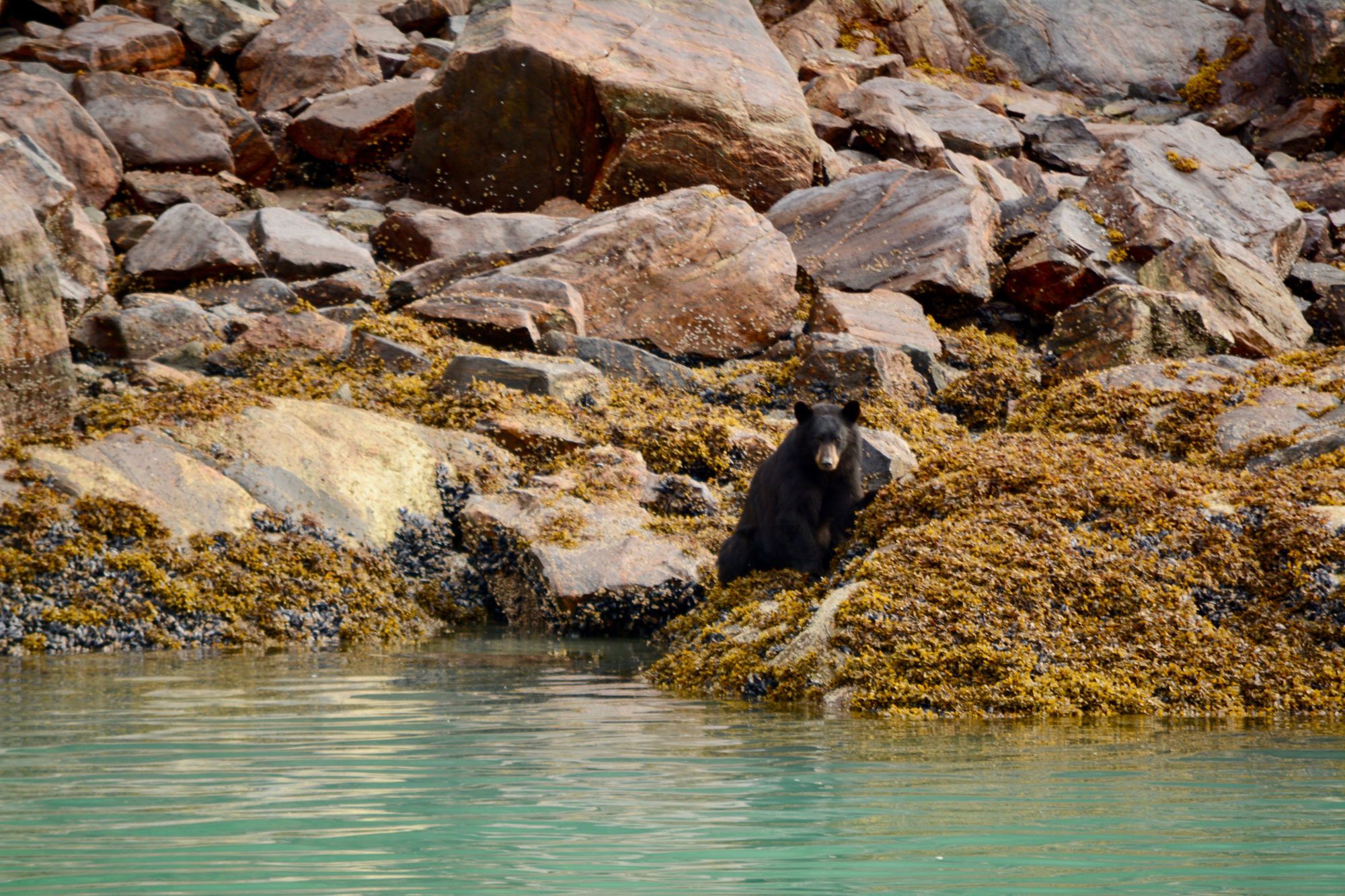 While rubbing our eyes and sipping our coffee, this morning we were called onto the bow for the encounter we had been waiting all week for: an American black bear in the intertidal zone, enjoying its breakfast. As we quietly watched from the ship, this bear munched on the barnacles and rockweed that was not quite submerged as the tide slowly rose. After about half an hour, we turned away, continuing into Tracy Arm fjord. Once again enjoying a spectacular lack of rain, the sun shone on the sheer mountainsides and sea foam green water that we would follow until it ended 22 miles later at the face of South Sawyer Glacier. This fjord is one of two arms of the Tracy Arm Fords Terror Wilderness Area, a pristine wilderness covering over 600,000 acres within the Tongass National Forest. For our morning excursion, National Geographic Sea Lion sent us exploring the last few miles in to the face of the glacier; it towers 200 feet above the surface of the water and continues 21 miles back to the Stikine Ice Field. On the expedition landing craft, we cruised around, hoping to see wildlife in the area, and our expectations were exceeded. Rounding one corner, we found a large family of mountain goats with their kids on the mountainside. The next corner exposed hundreds of harbor seals and their pups hauled out on icebergs, nursing until the pups are large enough to venture into the open ocean on their own. There was even a harbor porpoise cruising quietly through the water.
