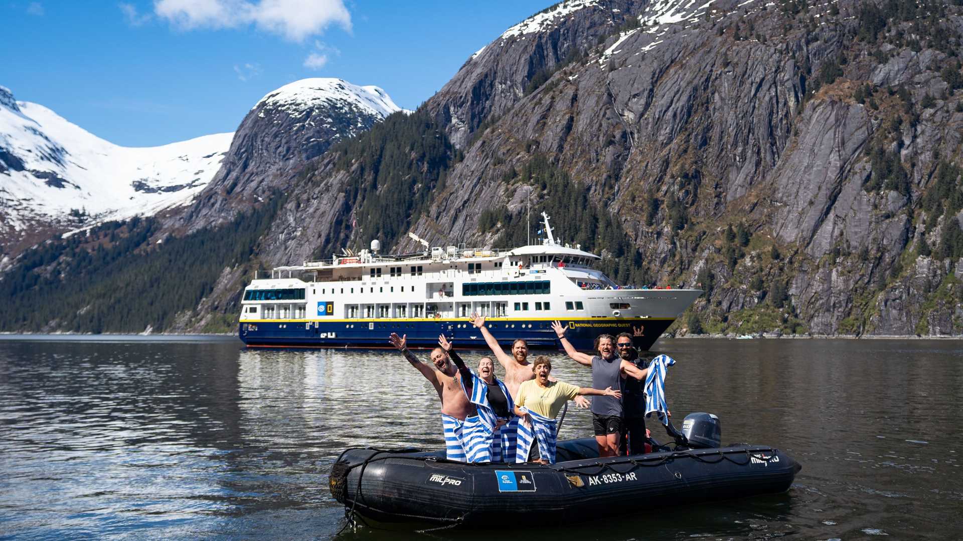 Long before the sun rose over the mountains surrounding the fjord known as Tracy Arm, our guests were lining the outer deck. First light came near 4:30 AM, and with it, excited travelers watched as National Geographic Quest navigated through the tight area known as, “The Narrows.” Throughout the morning, more and more people crowded onto the deck, aghast at the beauty of our surroundings in the fjord. Prior to breakfast, wellness specialist Allison Dickey led a distracted yet packed stretching class flanked by stunning granite on the sundeck.