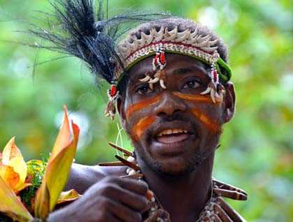 Early this morning we are anchored off of Tuam Island. There are a bit more clouds than blue sky and we go ashore prepared. As soon as our tender, Xplorer, touches the beach, the rain begins … not particularly heavy and certainly not cold. Our main worry was would the sing-sing be canceled, as we know this small island put on one of the best in the entire area. As we climb over the top of the long, narrow island the rain continues. Most of us notice the windbreaks made from palm and pandanus leaves, to protect house and garden from the prevailing winds particularly during the real rainy season. By the time we make it into the village the rain is just a bit more than a sprinkle and not enough to stop the dancers.