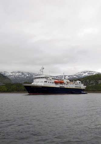 Hellemoboten offers opportunities for a variety of hikes and walks. This is the narrowest part of Norway and it is possible to walk to Sweden from here, but we did not quite have the six hours needed for that walk. We also had opportunities for kayaking in the calm waters of the fjord and for Zodiac cruises. We were charmed to see a young white-tailed sea eagle soaring over the fjord as well as several shore birds and a pair of Eurasian teals. We could also see the effects on the gneissic rocks of the fjord’s walls of the relaxation of the pressure produced by the several kilometers of ice which would have covered the area 18,000 years ago. This much ice pushes against the walls of the fjord and compresses the rocks, but when the pressure is released the rocks relax and fracture in concentric thin layers, a process called exfoliation. Many excellent examples were visible as we cruised along.