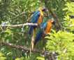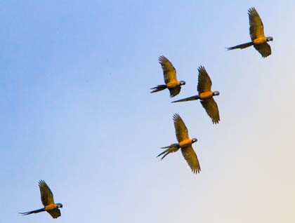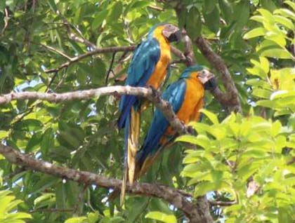 The Delfín II spent most of the night underway sailing the Ucayali River. We woke up early to take advantage of the pleasant temperature and better light for experiencing the jungle. We cruised in search for wildlife, and our first exciting finding was a nesting area for (Ara ararauna) blue-and-yellow macaws! These magnificent birds make the tropical rain forest come alive with their bright colors and their loud calls. Like most parrot species, they are monogamous and are commonly seen flying in distinctive pairs, even within a larger group. The same area of tall dead palms, also offers good nesting sites for the abundant red-bellied macaws, (Orthopsittaca manilata).