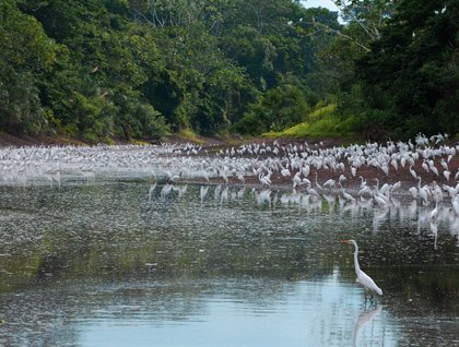 After lunch we went kayaking and skiff riding on Nauta Caño. This narrow creek provided welcome shade on this hot sunny day and excellent wildlife watching. It was the afternoon of the great egret. In one inlet that was quickly drying up, there were probably 500 of the tall white birds standing crowded in the shallow water and on the edge of the banks. They were our constant companions for the rest of the excursion too, lining all the banks. At a glance the distant ground was just a sea of white. A more unique bird we saw was the laughing falcon. It looked like the hawk version of Zorro, no sword but with a perfect black mask on a white face. On our way back down the creek we saw capybara tracks in the mud and a quick glimpse of one grazing the shoreline grasses. But the world’s largest rodent (140 lbs) did not want to see us, so off it went.