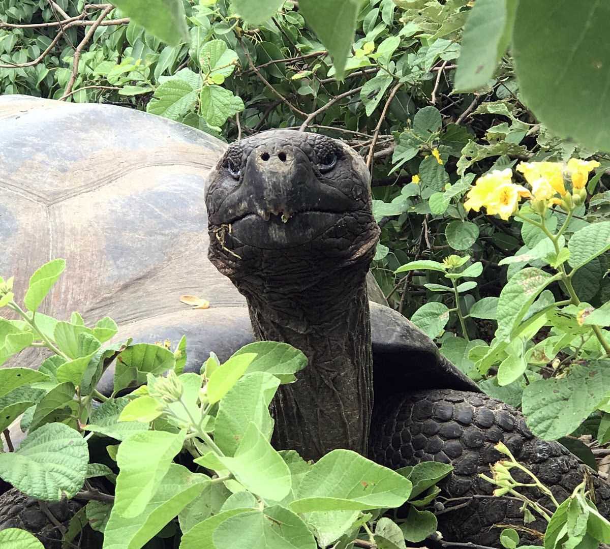 We walked through a thick forest of Galapagos cotton, yellow cordias, and palo santo trees; along the path, we were surprised to find several Galapagos giant tortoises. Most were large males, and while some were sleeping, a particularly friendly one was feeding on the yellow flowers of the cordia and Galapagos cotton. We sat down for a couple minutes and saw this tortoise enjoying a good meal of yellow flowers and fruits.