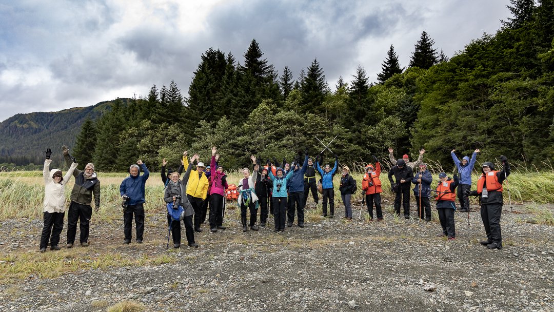 Many of our guests book their trip for one reason – they want to see a brown bear roaming free in wild Alaska. This morning, they got their wish! We dropped anchor in Pavlov Harbor located on the northeast coast of Chichagof Island. The area hosts a productive salmon stream, and the bears were there to feed! We staggered our guests to keep the groups to a manageable size and headed for the landing. Bears were seen even before we landed, and as we approached the stream we saw two large sub-adult female brown bears near the water. Closer to the small cascading waterfall, a mother bear was teaching her two cubs to fish while gorging herself on the abundant salmon. One more sat close to the waterfall, seemingly satiated on the feast provided by the returning salmon. Our first group returned to the ship, and we kept our fingers crossed that the bears would remain. We were not disappointed! In fact, the second viewing was possibly even more exciting. A total of eight bears were seen, and while we watched the waterfall action, the mother and her two cubs emerged behind us on the trail we intended to use! Our plans quickly changed; we loaded our Zodiacs and made our retreat, allowing the bears full access to the beach and their salmon breakfast. Before we pulled anchor and left Pavlov Harbor we had one more “real” Alaskan experience, the polar plunge! Seventeen brave souls lined up along the beach and charged into the chilly water. All survived and headed back to the ship for a hot shower and lunch.