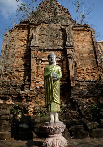 During breakfast a rise appeared above the river ahead—a rocky anomalous bluff—which has remained above the annual high water flooding of the Mekong for at least 1400 years. For this reason it has always been a holy site, as evinced by the remains of a few 7th century pre-Angkorian stupas set in the midst of a modern Theravada Buddhist temple. The “old way” of the dominant Cambodian religion of Theravada Buddhism was our theme for the day, which our guides Rithy and Vuthy presented on our walk through the many temples, living areas, and schools of the monks. The colorfully painted concrete statues of tropical fruits and animals, which are used as educational tools in the community temple, also captivated our attention and our photographic interest.