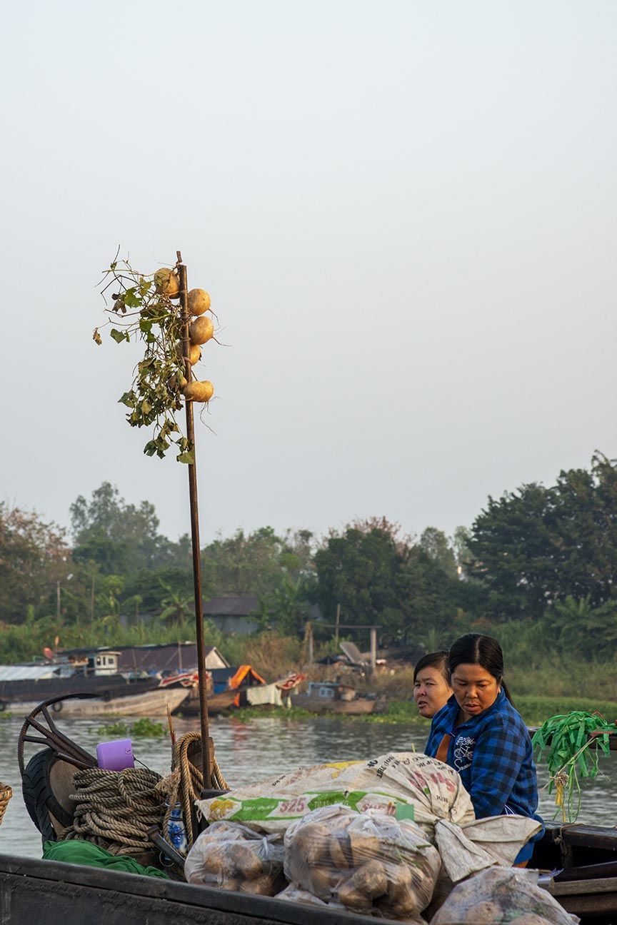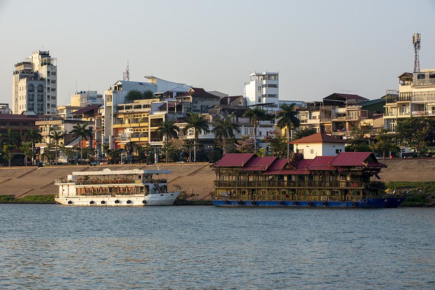 We woke up in a different world, with a deep red Mekong sunrise glowing to orange as it rose over the palms and grasses of the high riverbanks, with the gray-green waters of the wide-but-shallow Mekong carrying downstream with steady purpose. Small wooden fishing boats and stilted fishing camps were interspersed along the embankment, and we seemed to be so far away from the great Angkorian cities and temples in which we lived for the past few days. Sunrise and sunset are the most beautiful and the most active times on the river, so on the Jahan we always try to be cruising for “the golden hours.”