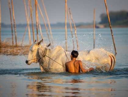 At 4:00 p.m. we departed the Jahan and walked up the steep riverbanks to the quaint and beautiful village of Angkor Ban with a population of approximately 1,000 people. We first were able to walk through their colorful temple complex with its many buildings and stupas as well as a large statue of a seated Buddha and one that was reclining. Then we proceeded through the village itself with its ancient stilted houses, often with tall handsome white Brahman cattle below. We also had the opportunity to visit one of the local homes with its amazing see-through bamboo floor, which keeps the house cool for sleeping.