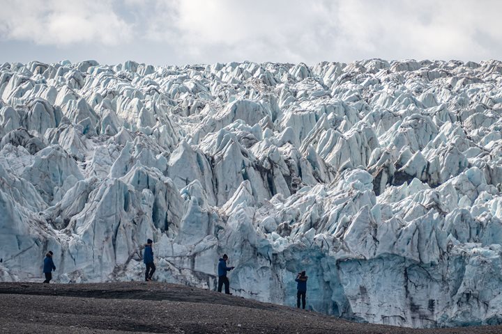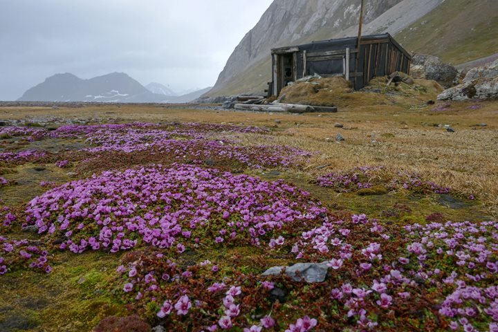 Over breakfast we enjoyed the fantastic views, especially after yesterday’s fog. After a short boat ride, we are all ashore on the flat tundra landscape with rock outcrops and snow fields. Guests had a few different hike options today, from a short stroll along the water to a longer, more athletic hike that I led – 13 brave souls chose to follow me! After about 30 minutes ashore the sun broke through, making the weather go from good to wonderful! Many of us had to take off several layers of clothing and some even hiked in shorts! (Although this crazy behaviour was only seen in the longest hiking group!)