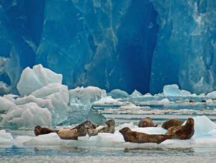 From Williams Cove we traveled up Tracy Arm fjord, a scenic, narrow, deep and twisty waterway that was carved by a glacier and subsequently filled with seawater. South Sawyer Glacier sits at the head of the channel, tumbling from the Stikine Icefield down to and below sea level. We passed Sawyer Island and Sea Lion paused to lower our inflatable boats and we set out towards the face of the glacier with our cameras in hand. The great mass of ice glowed with incredible hues of blue. It was a spectacular afternoon! Not only was the glacier active as large chunks of ice broke off and crashed into the water, producing icebergs, but there was wildlife to be seen as well. Harbor seals rested on icebergs, not even flinching in the chaos of the glacial calvings. This spring’s pups are now completely weaned and on their own. As a surprise and a treat, we were delighted by three mountain goats that scampered down the hillside almost to sea level! Patches of sunlight graced the dramatic landscape around us – colorful glacier-scoured rock walls that rise a few thousand feet straight up from the water.