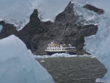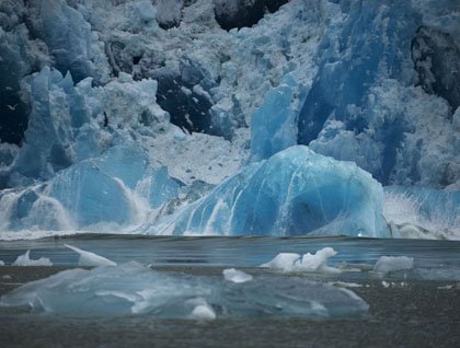 By now, we all knew how to recognize the proximity of tidewater glaciers. The color of the water went from deep to pale jade as glacial flour in the water thickened. Icebergs became more and more numerous. And here we dropped small boats for a close look at South Sawyer Glacier.