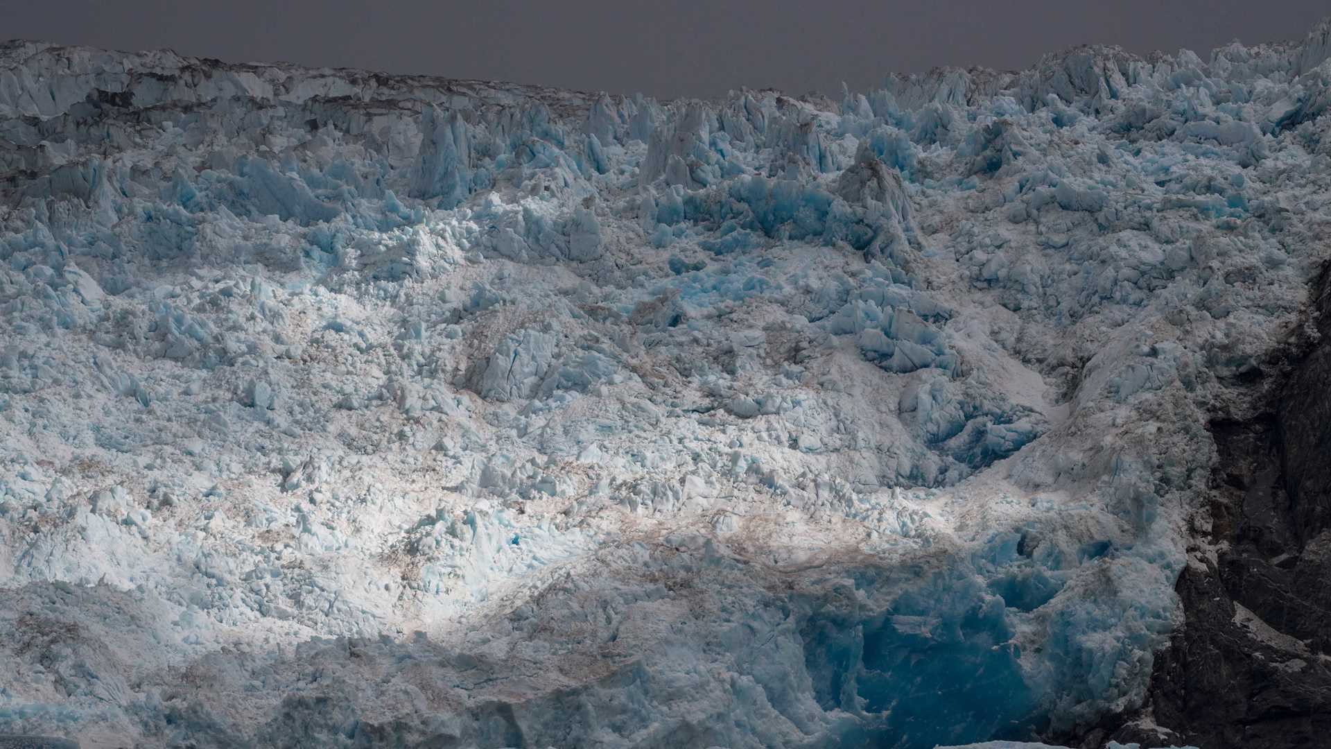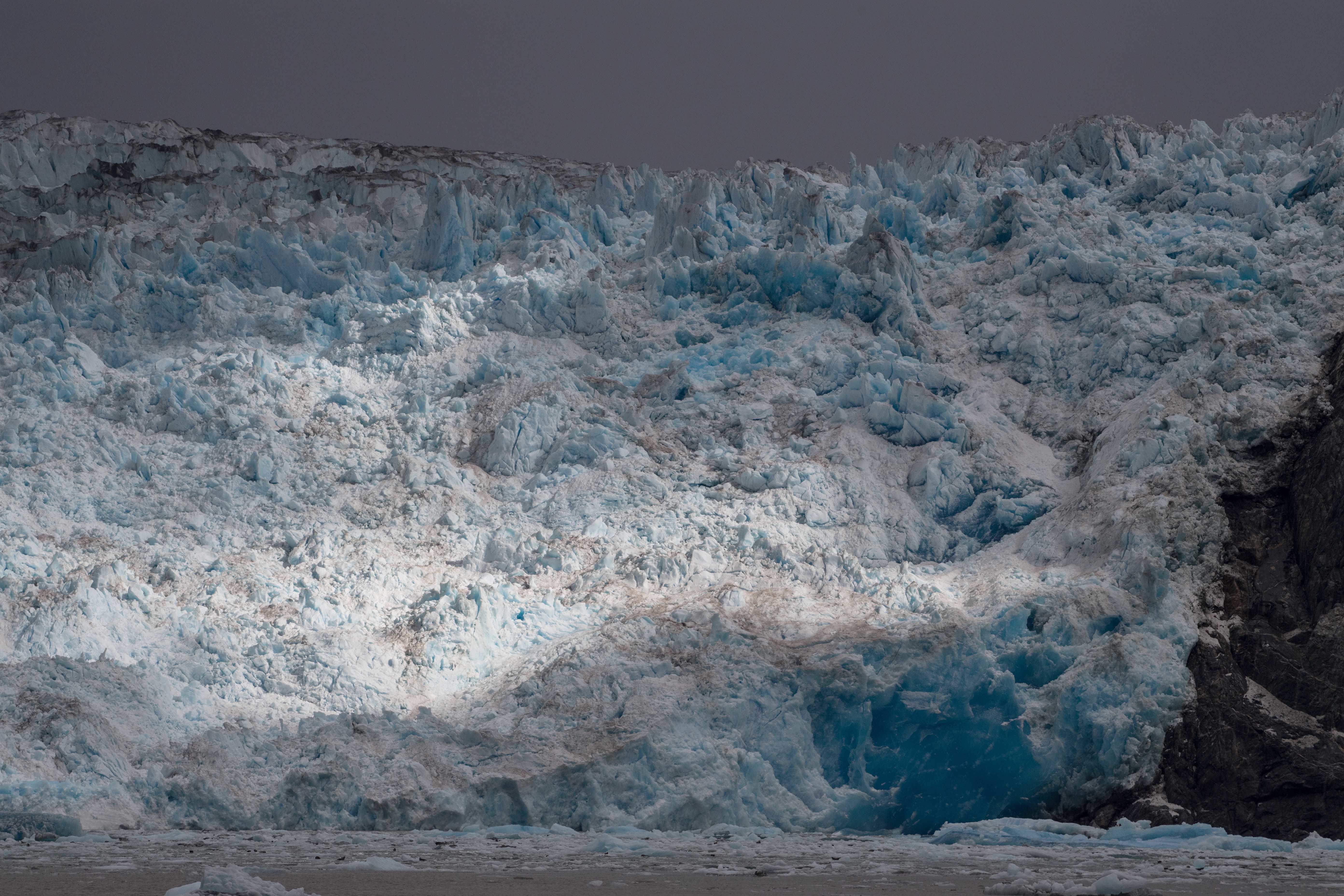 The weather throughout the day would be a good example of what Southeast Alaska is truly like. One moment sun, and the next rain, and then sun, and once again rain. It did not deter us and like all true explorers, we endure and continue our voyage of discovery. Now we were headed to Tracy Arm and South Sawyer Glacier. In route, a presentation on photography wets our appetite for the images we hope to make here in Alaska. Our path is the same one the glacier took as it carved out the fiord on which we were sailing. Large pieces of deep blue ice were becoming more numerous and we could hardly wait to see what lay ahead. Then, like a tale from the adventures of Sinbad, the great river of ice came into view. The overcast sky actually added to our experience buy intensifying the colors of the ice. Into our inflatables for some up-close viewing of icebergs and a close view of the glacier. As the sun would peer in and out, stunning rays of sun would light up the ice and made for spectacular views and photos.