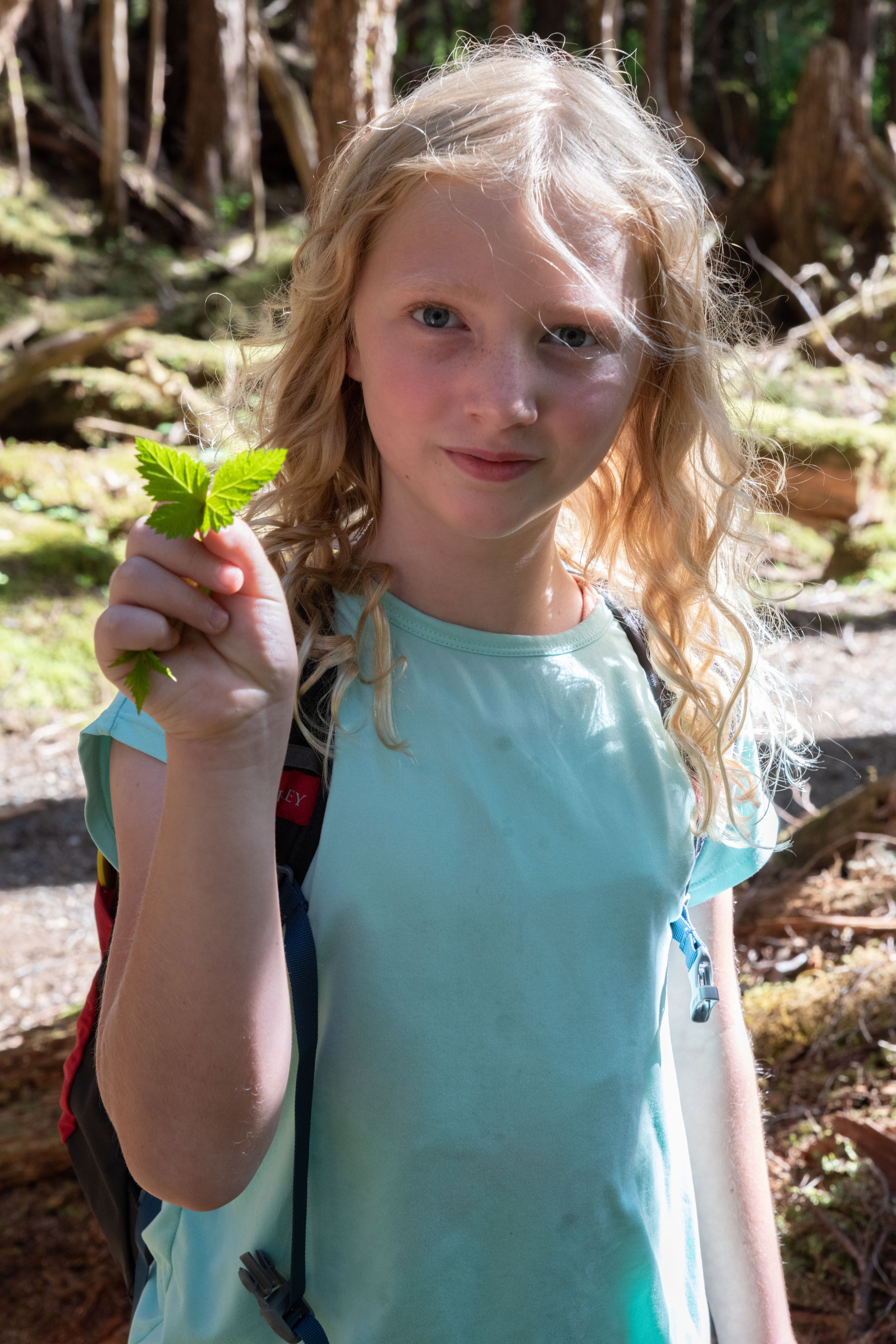 On the approach to the trailhead, we walked through a neighborhood of Wrangell where large houses with big windows overlooked the bay. Many ornamental plants were in full bloom, including rhododendrons and azaleas. Stepping into the forest on the Dewy Mountain trail, we were immediately transported to a new environment. Along the way, we observed many plant species of the coastal temperate rainforest. We enjoyed the hike up a well-established boardwalk to a beautiful viewpoint overlooking the town and the bay.