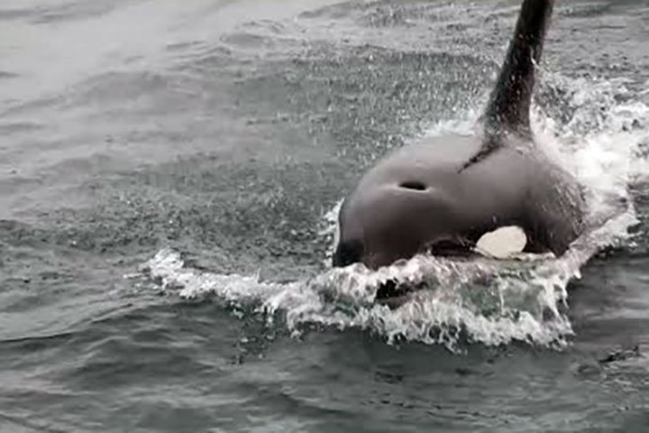 A pod of orcas emerge from the water while gannets fly and hunt above it.