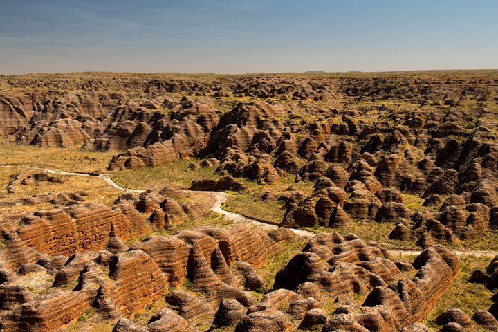 Unusual orange-and-black striped sandstone formations stretch across nearly 600,000 acres of the Kimberley, creating a stunningly unique and geologically exceptional landscape. Resembling giant beehives, the Bungle Bungle Range is a maze of conical towers sculpted by wind and sand into varying heights, with the tallest soaring nearly 1,000 feet upwards to the blue desert sky. Winding gorges and narrow chasms intersect the cone karsts, which are further enhanced by fan palms and seasonal waterfalls.