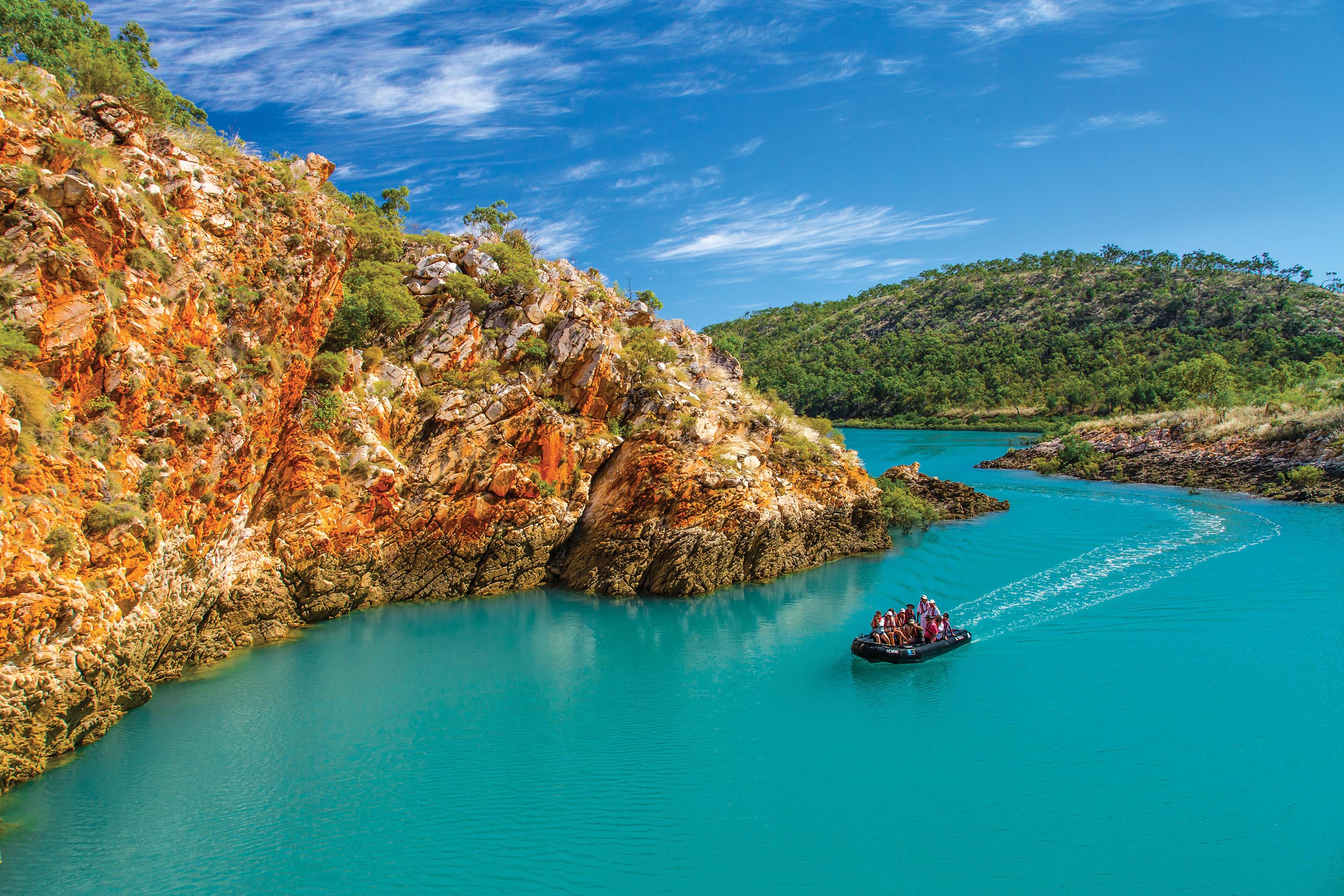 As the 33-foot seawater tide rushes through two narrow gorges of the McLarty Range and into the turquoise water of Talbot Bay, a forceful horizontal stream of water produces waterfall rapids. Tide peak flow can reach 15 knots at the aptly named Horizontal Falls, which squeeze through rocky openings that are respectively 39 and 67 feet. The incredible power of enormous volumes of water traveling quickly through an enclosed area rotates the flow and creates currents, rapids, and whirlpools that in certain conditions are possible to navigate. An exhilarating ride that trumps any theme park flume, a Horizontal Falls crossing is an expedition highlight that, like most of the Kimberley, is not easily accessed. In the 1,000-island Buccaneer Archipelago, Horizontal Falls is so remote that any type of approach by road is impossible.