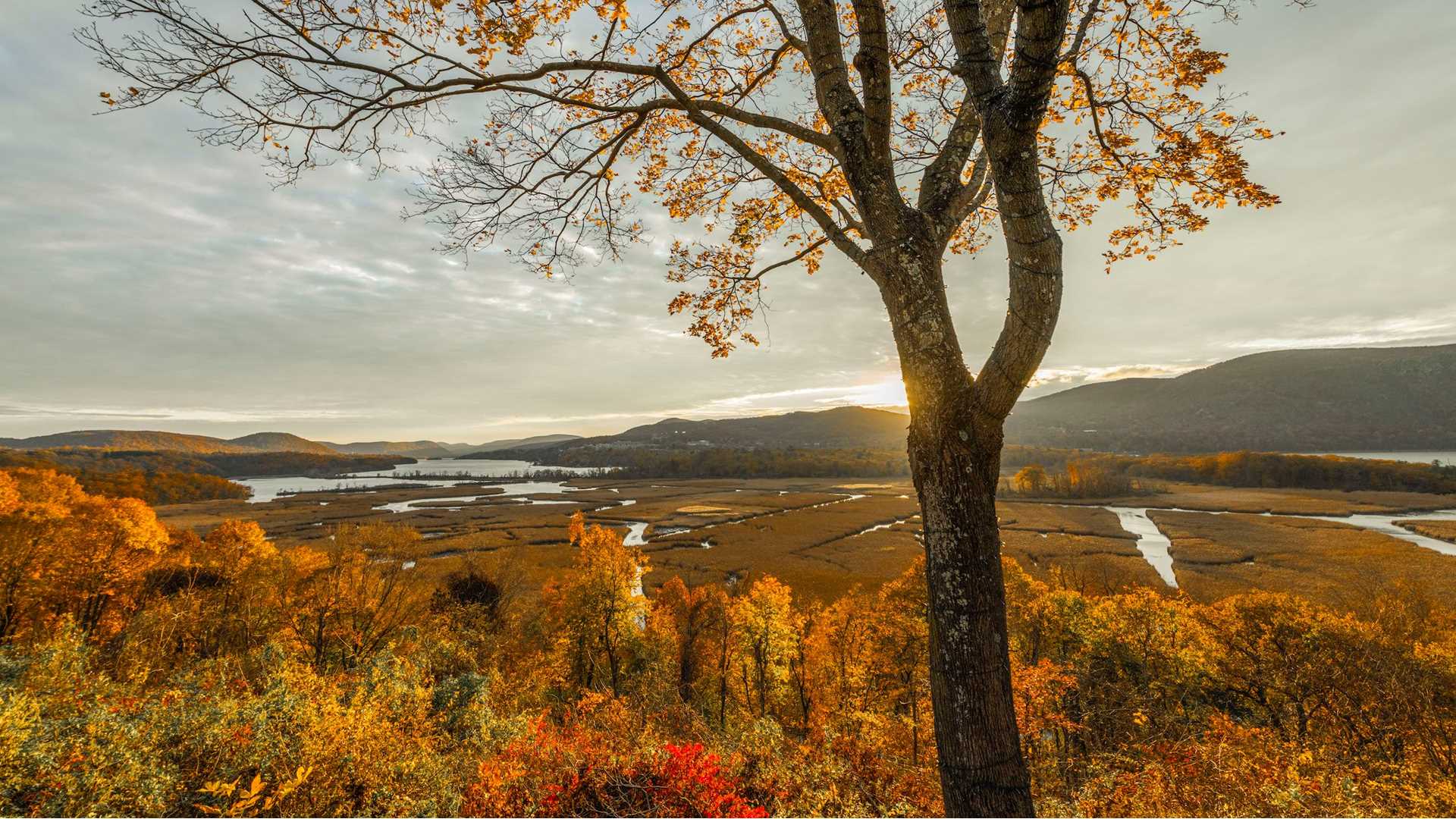 Vistas of autumnal leaves and the umber fall fields of Constitution Marsh as seen from the neighboring Boscobel House and Gardens.