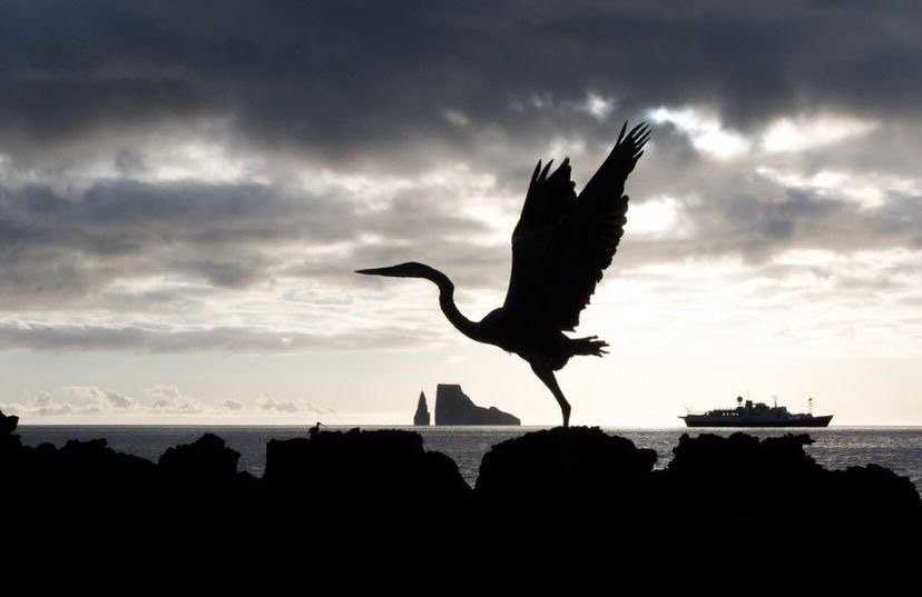 A heron silhouetted against the sky, with National Geographic Endeavour II and Kicker Rock in the background. (photo by Jonathan Aguas)