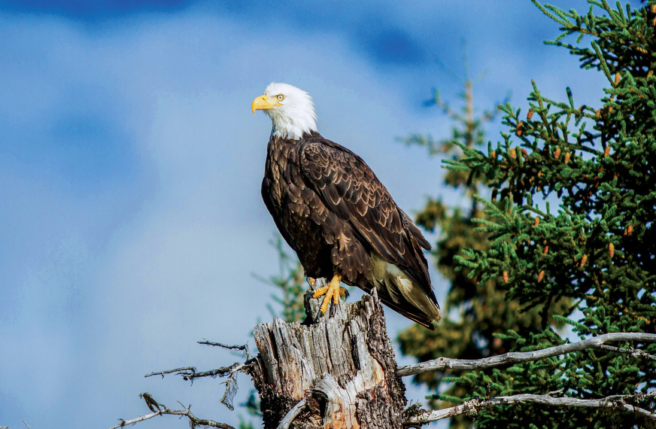 Key Traits: White feathered head; long white tail feathers; dark brown body; bright yellow feet; hooked beak; can reach 34 to 43 inches and 6.5 to 14 pounds; average wingspan 6 to 8 feet. Juveniles: Brown body with brown and white mottled wings.
