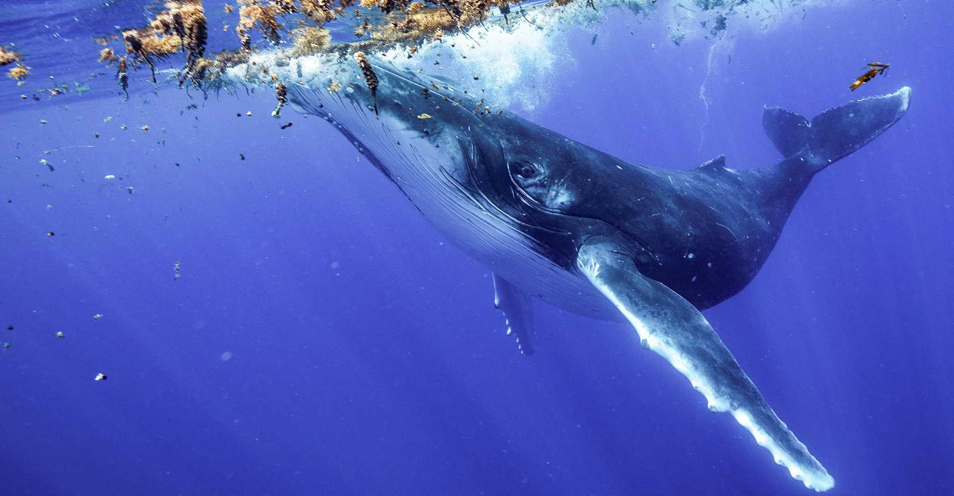 How to Spot Them: Black or gray dorsal side, mottled black and white ventral side; pectoral fins nearly 1/3rd the length of their body; bump-like knobs (tubercles) on top of head and upper jaw; vertical ventral pleats along underside of jaw down to the stomach; can reach up to 52 feet long and 40 tons.